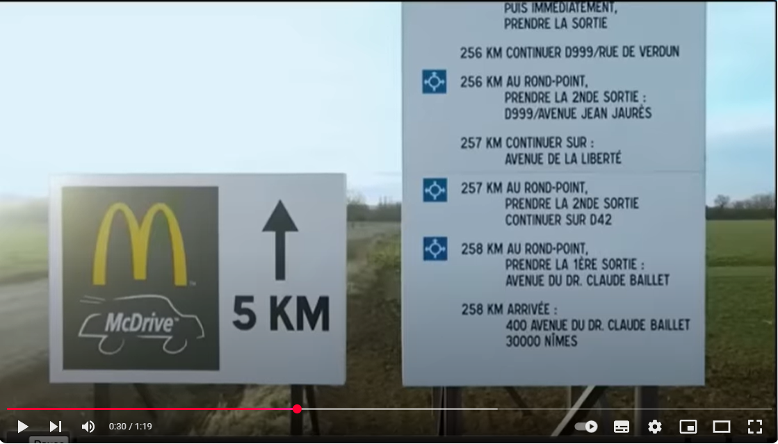 세 번째 사례는 맥도날드 vs 버거킹의 사례이다. 선공은 맥도날드였다. 2016년, 프랑스의 한 시골 마을 브리우드(Brioude)에서 맥도날드는 대형 광고판을 설치하여 가장 가까운 버거킹 드라이브스루까지의 경로를 상세히 안내했다. 이 광고판은 버거킹 매장까지 258km에 달하는 복잡한 경로를 보여주었고, 그 옆에는 "맥도날드 드라이브스루는 단 5km 거리입니다"라는 문구가 적힌 작은 광고판이 함께 설치되어 있었다. 광고 마지막에는 "With more than 1000 McDrive, McDonald's is closer to you"라는 광고 카피와 함께 버거킹 대비 뛰어난 접근성을 강조했다. 버거킹의 반격도 인상적이었다. 광고에서 부부가 맥도날드 드라이브스루에서 커피만 주문하며 "갈 길이 멀다"고 말한다. 알고 보니 그들의 최종 목적지는 253km 떨어진 버거킹 매장이었다. 광고 카피는 "와퍼를 즐기기 전까지 겨우 253KM. 어디에나 있어줘서 고마워요 맥도날드"였다. 맥도날드를 버거킹을 찾아가기 전까지의 피곤함을 달래기 위해 커피를 구매하는 브랜드로 전락시켜 버렸다.